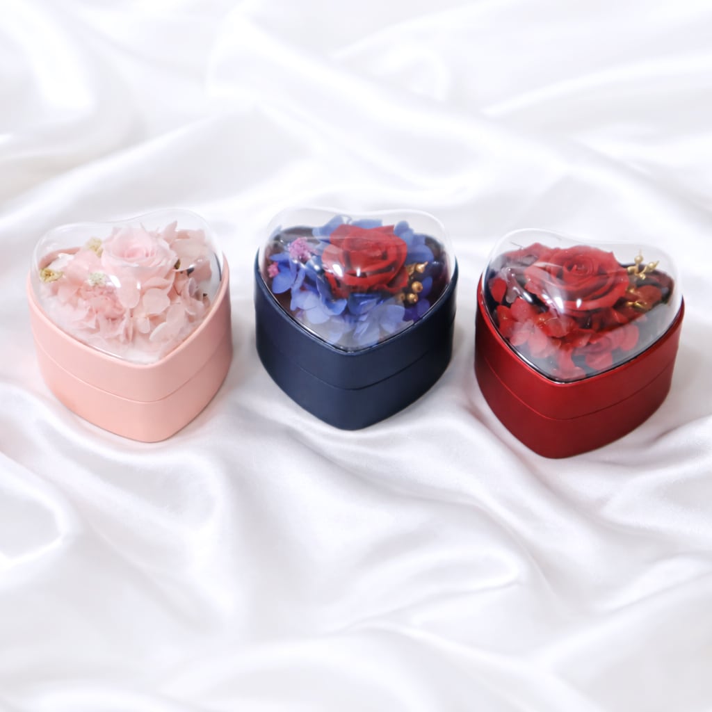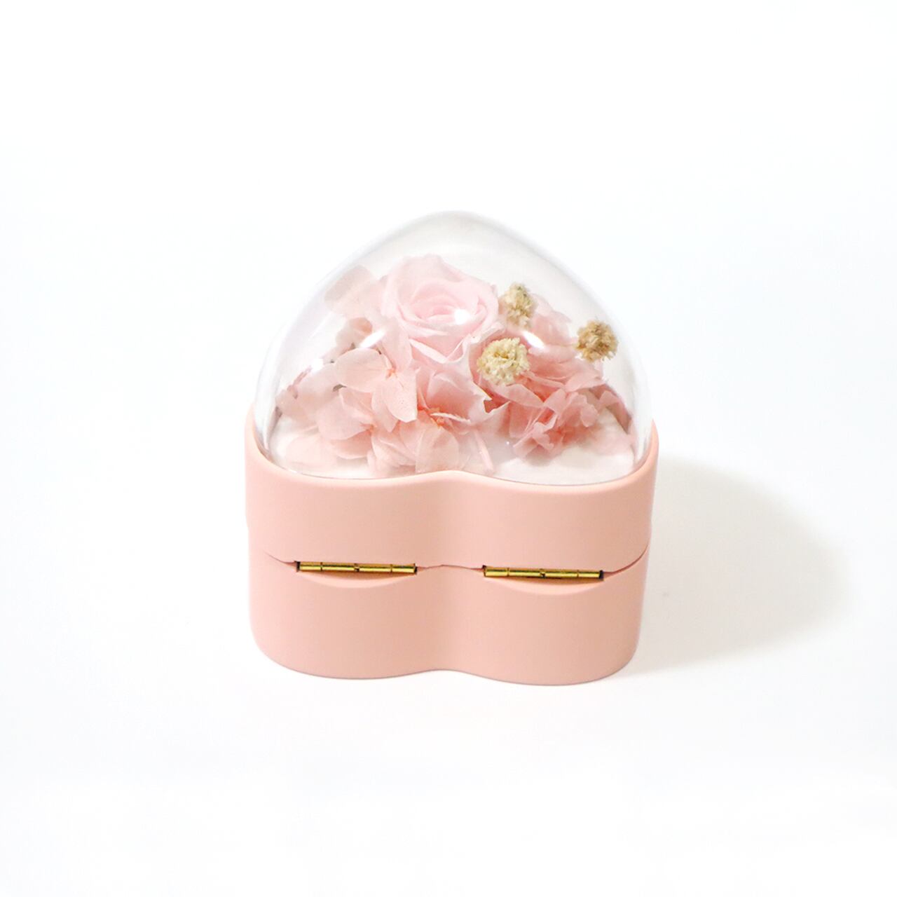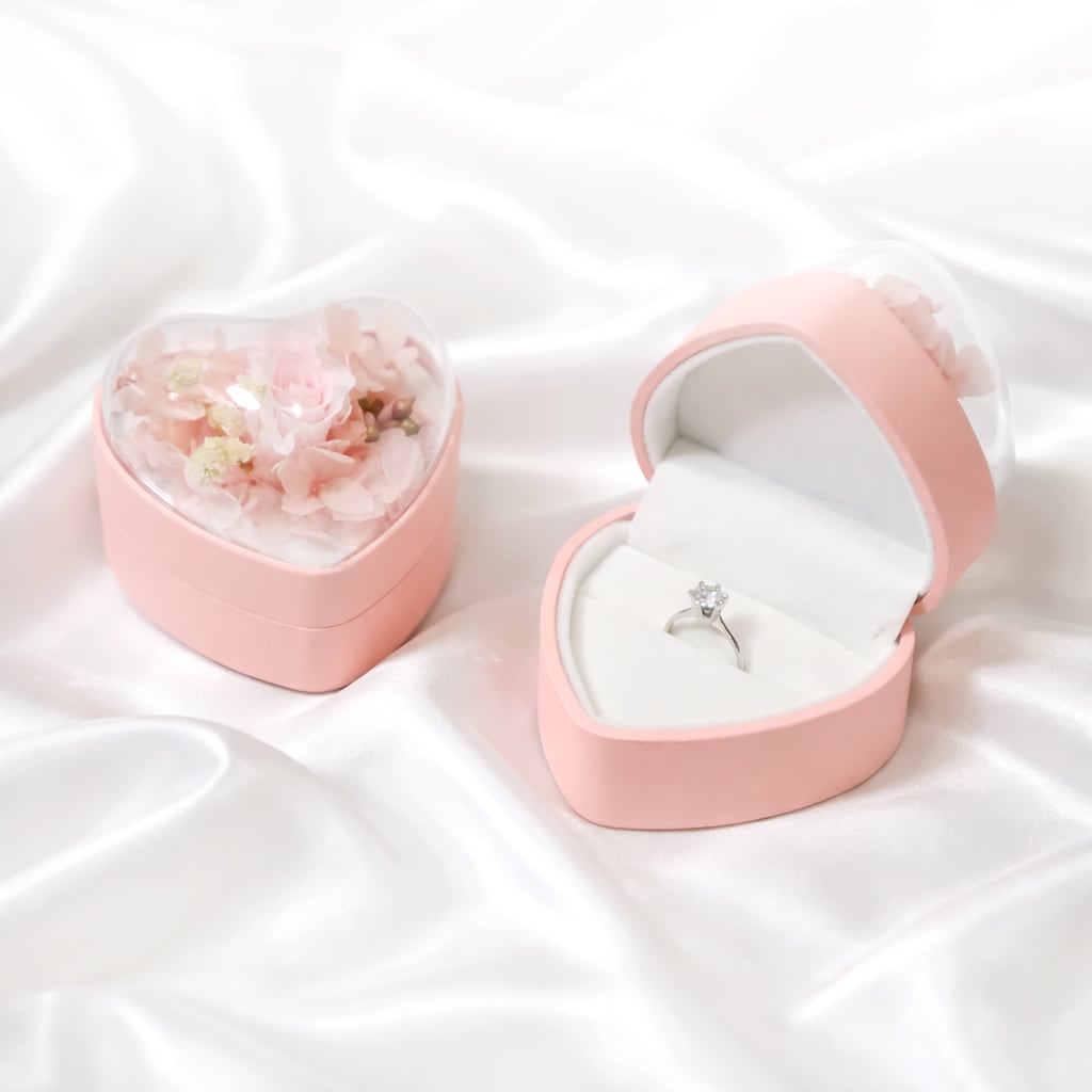 淡いピンクのバラのプリザーブドフラワーを閉じ込めたプロポーズに最適な指輪ケースです。