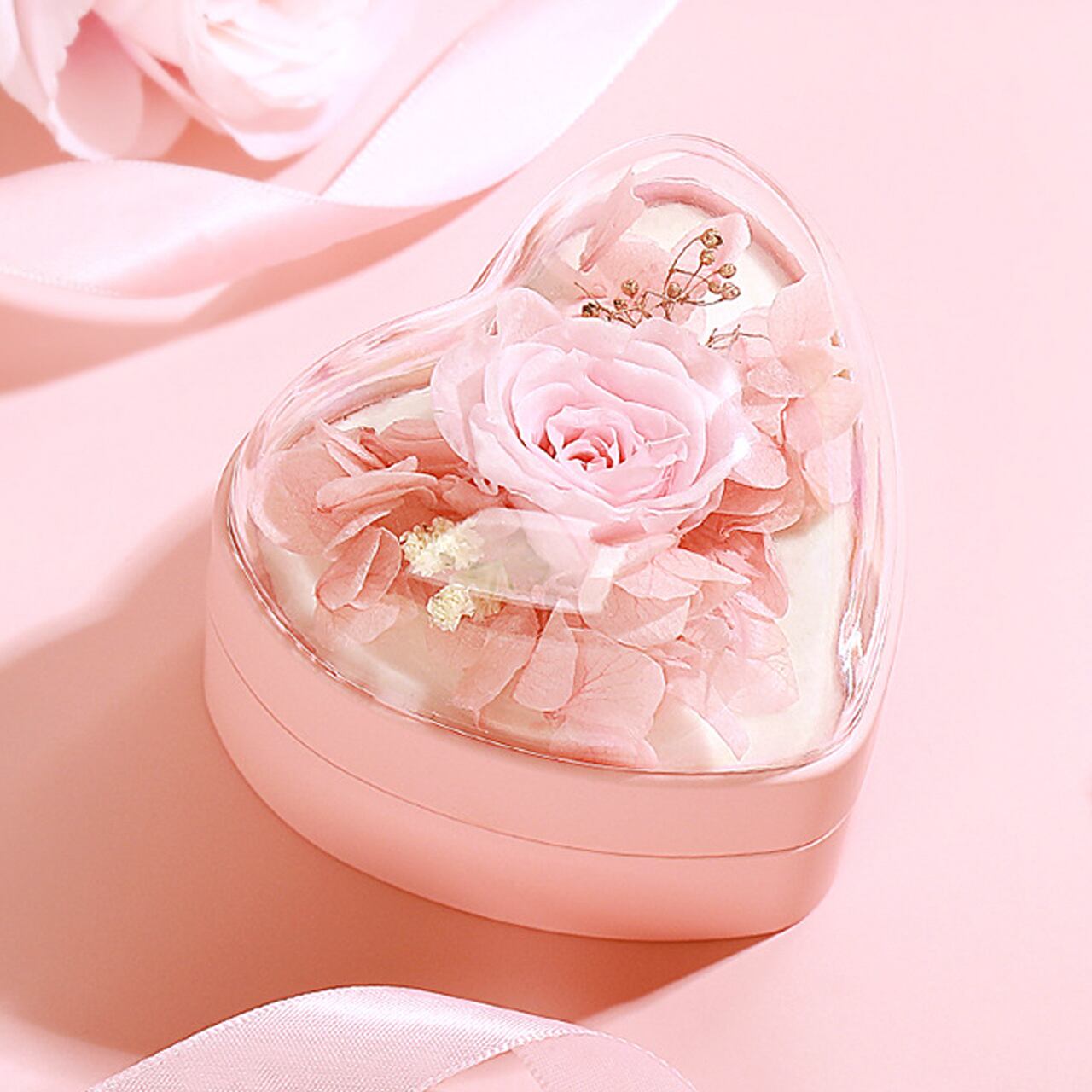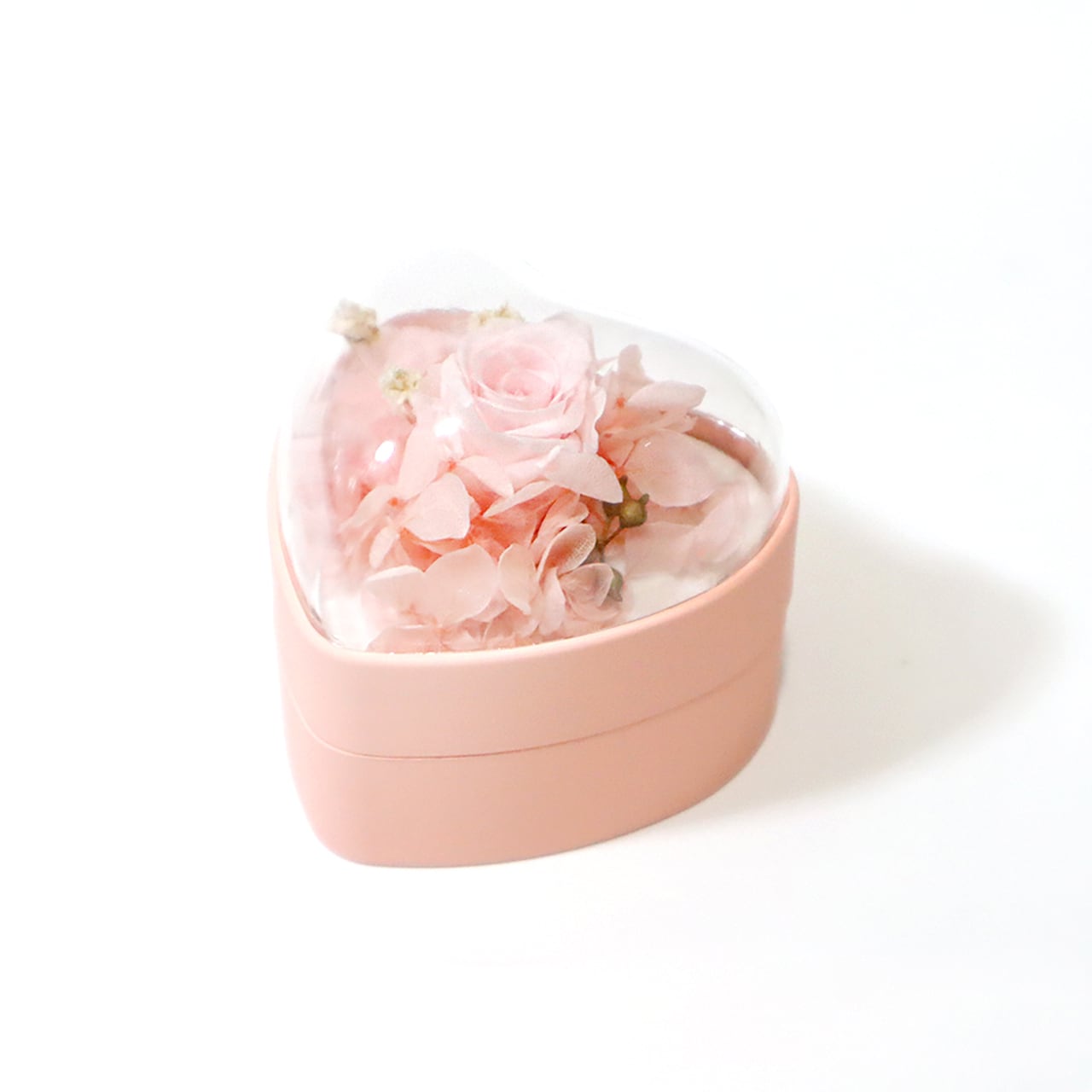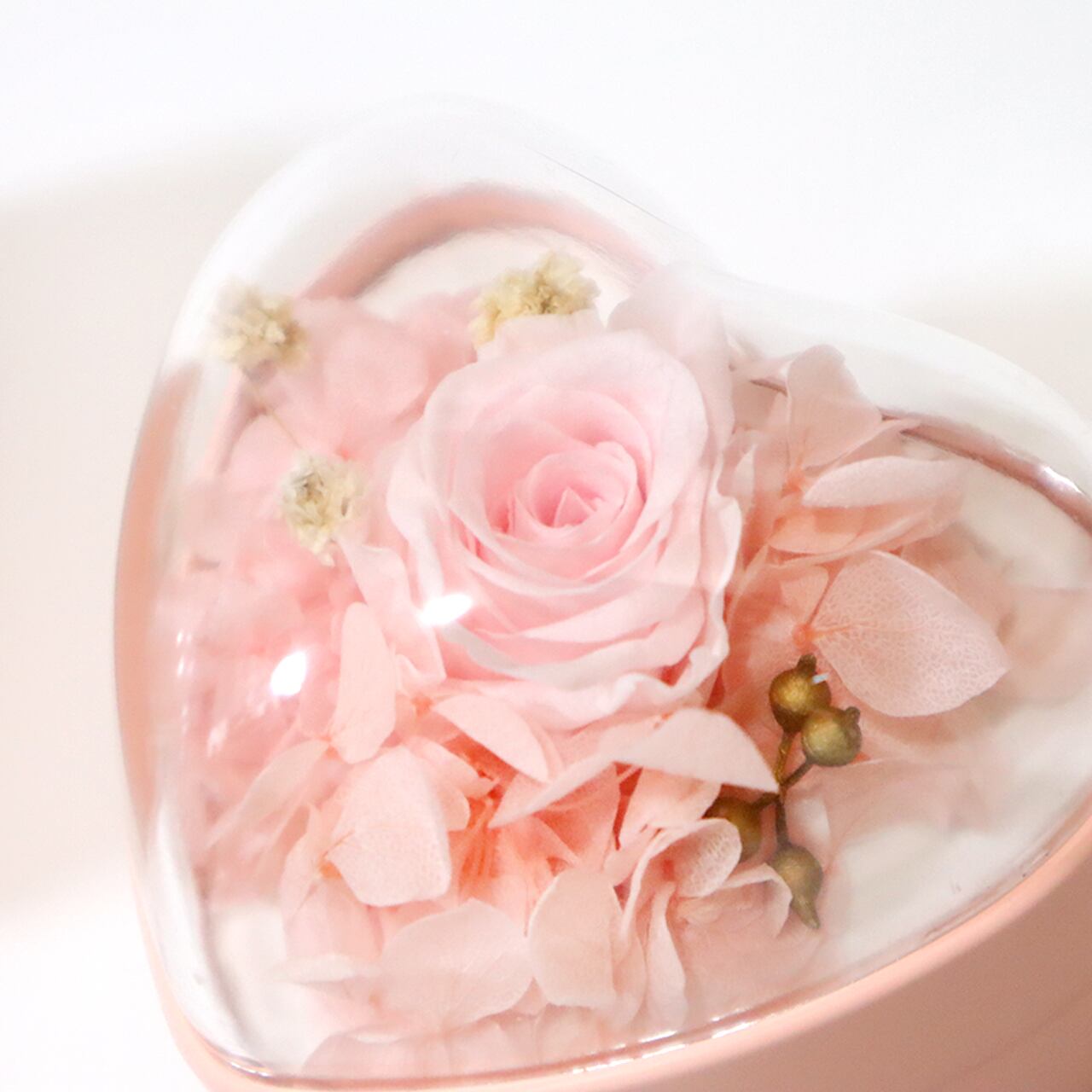 淡いピンクのバラのプリザーブドフラワーを閉じ込めたプロポーズに最適な指輪ケースです。