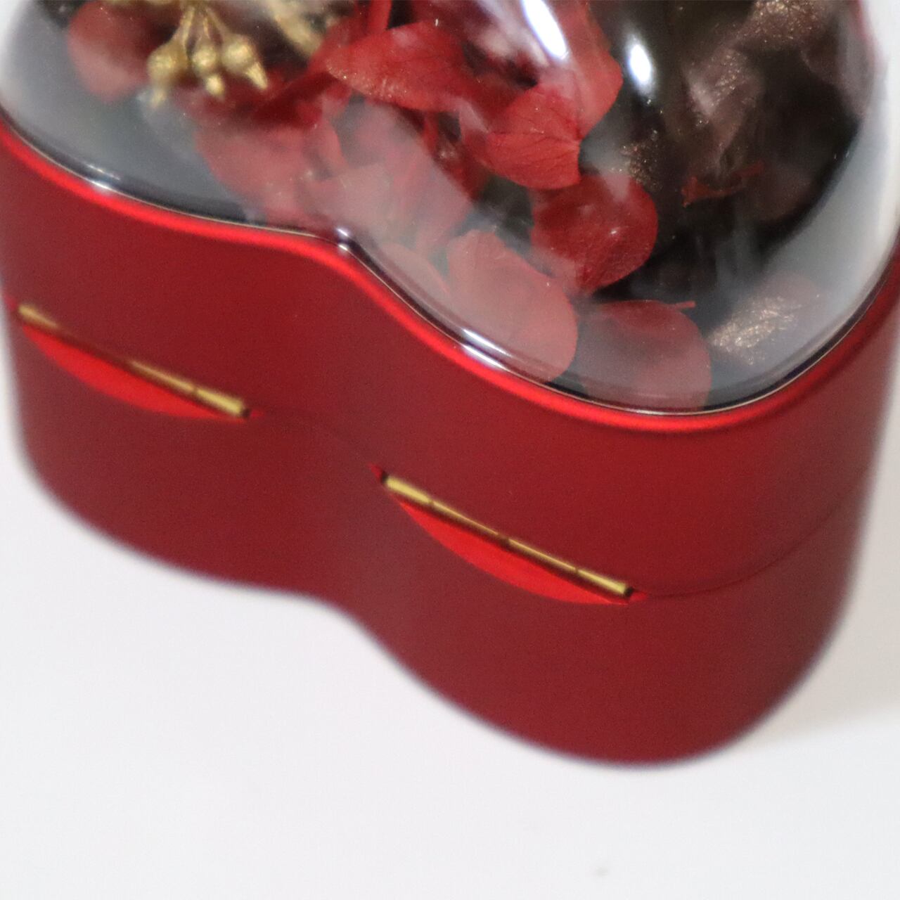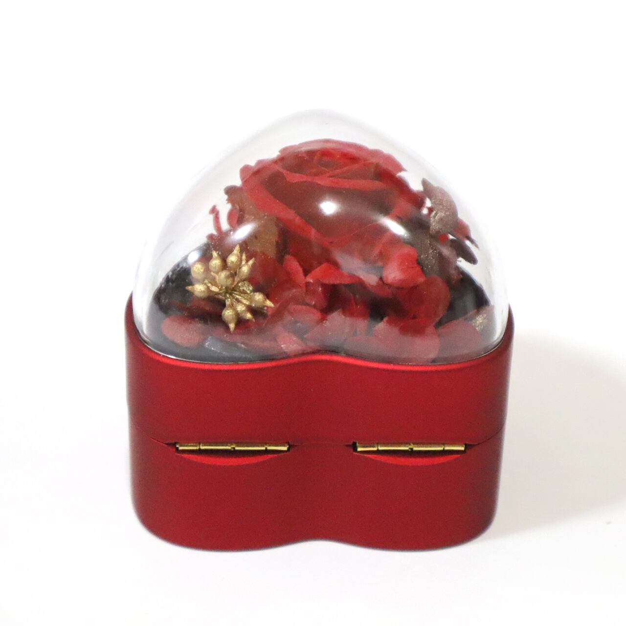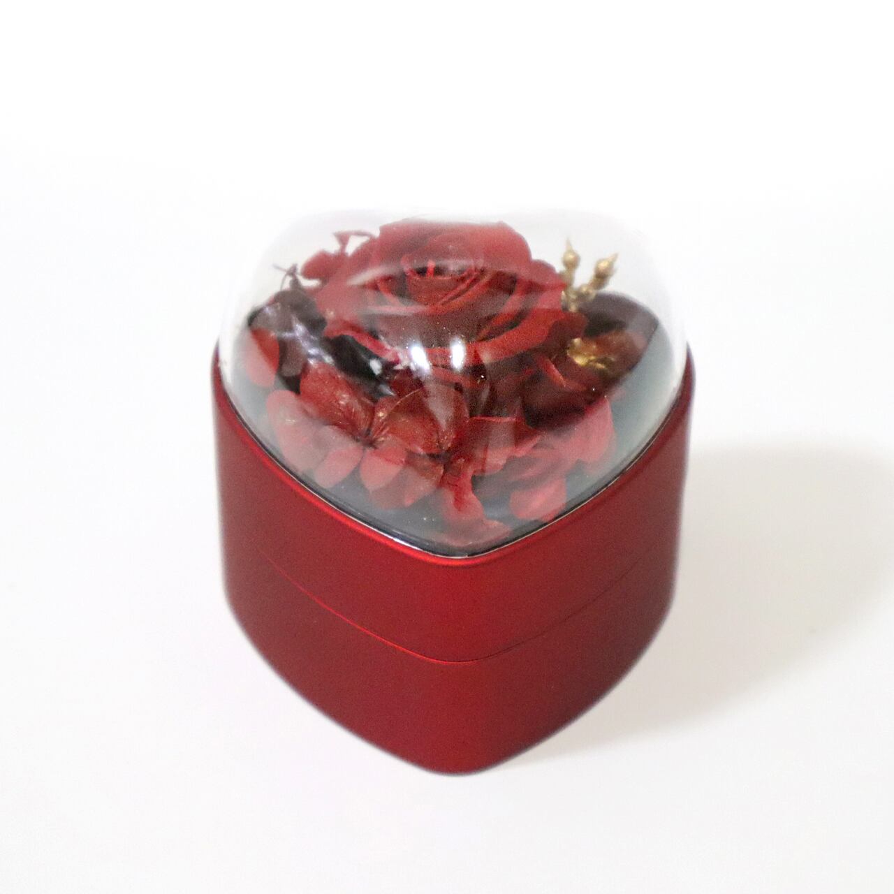 真紅のバラのプリザーブドフラワーを閉じ込めたプロポーズに最適な指輪ケースです。
