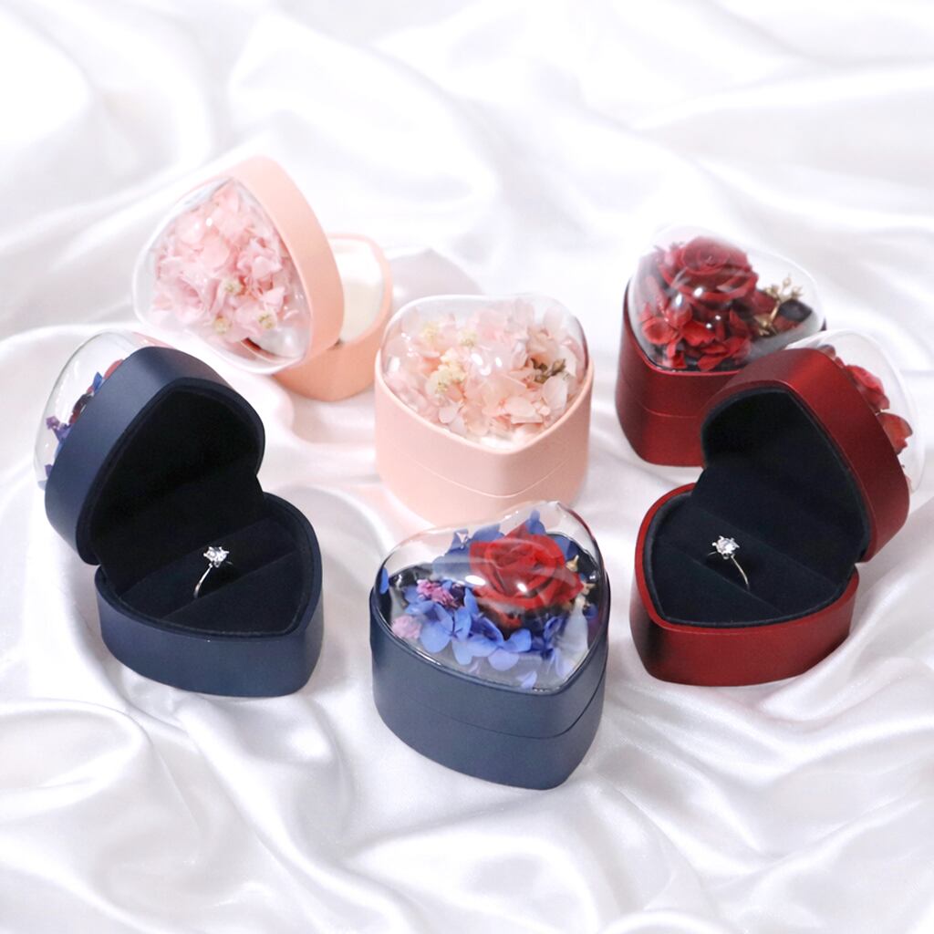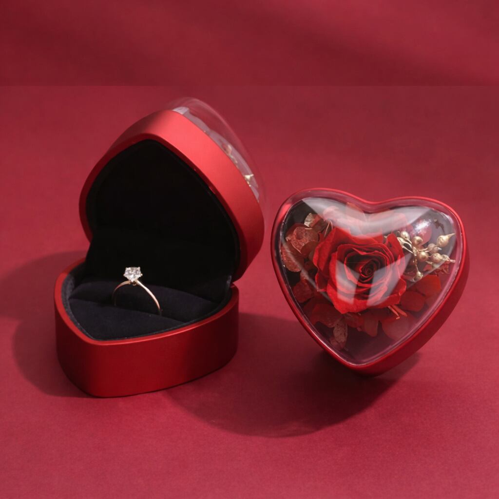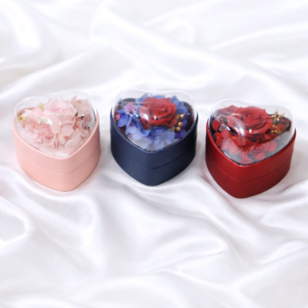 真紅のバラのプリザーブドフラワーを閉じ込めたプロポーズに最適な指輪ケースです。